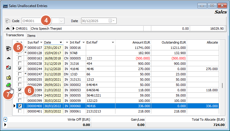 SFM has a tool (available both in the sales and purchase ledger) that cycles through all the entities that have unallocated entries and enable you to allocate them. Below are instructions on how this is done.